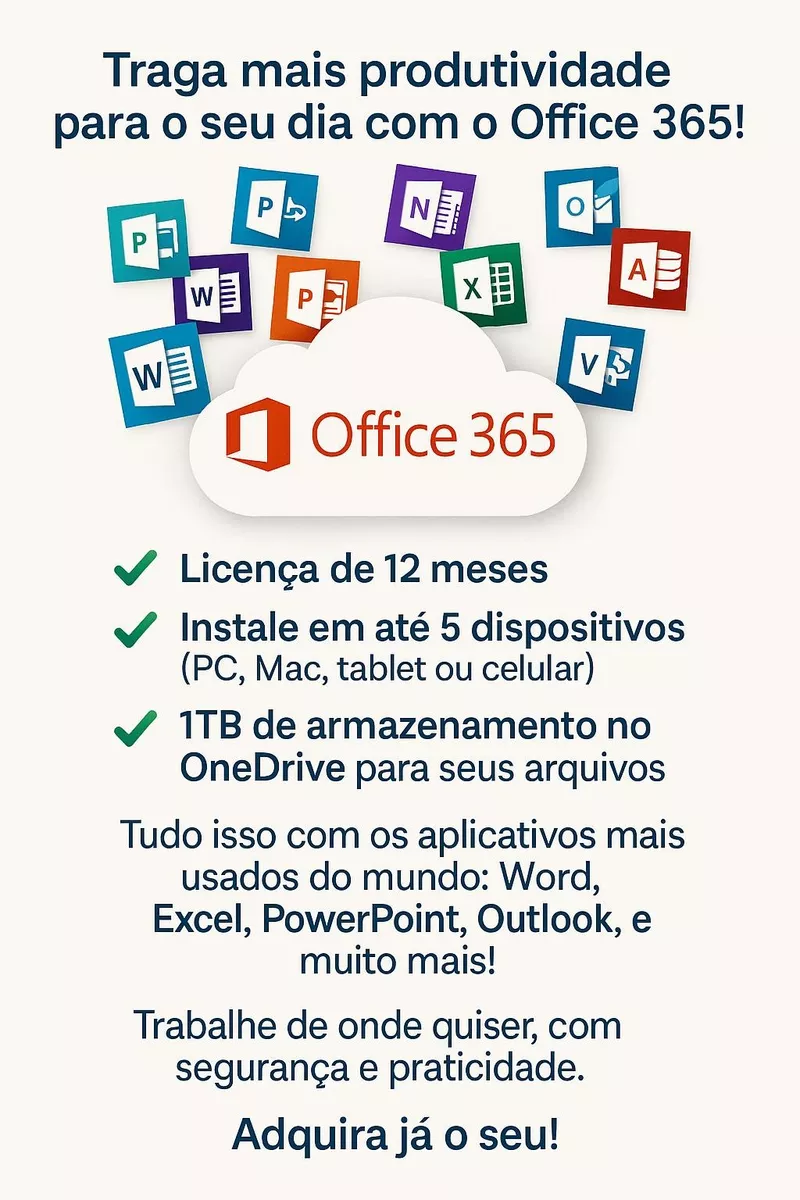 - Versões instaladas completas do Word, Excel, PowerPoint, Outlook, OneNote e muito mais.
